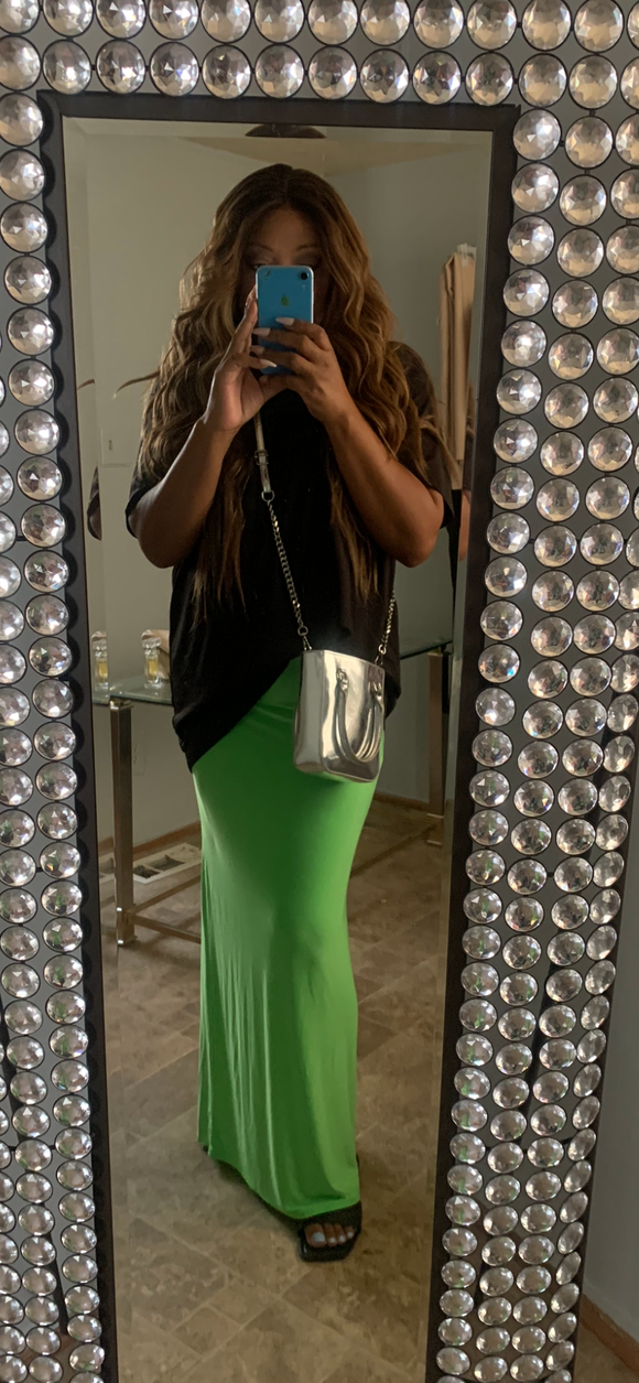 Showcasing this trendy outfit with an oversized black T (WalMart) coupled with a neon green maxi pencil skirt (boohoo)